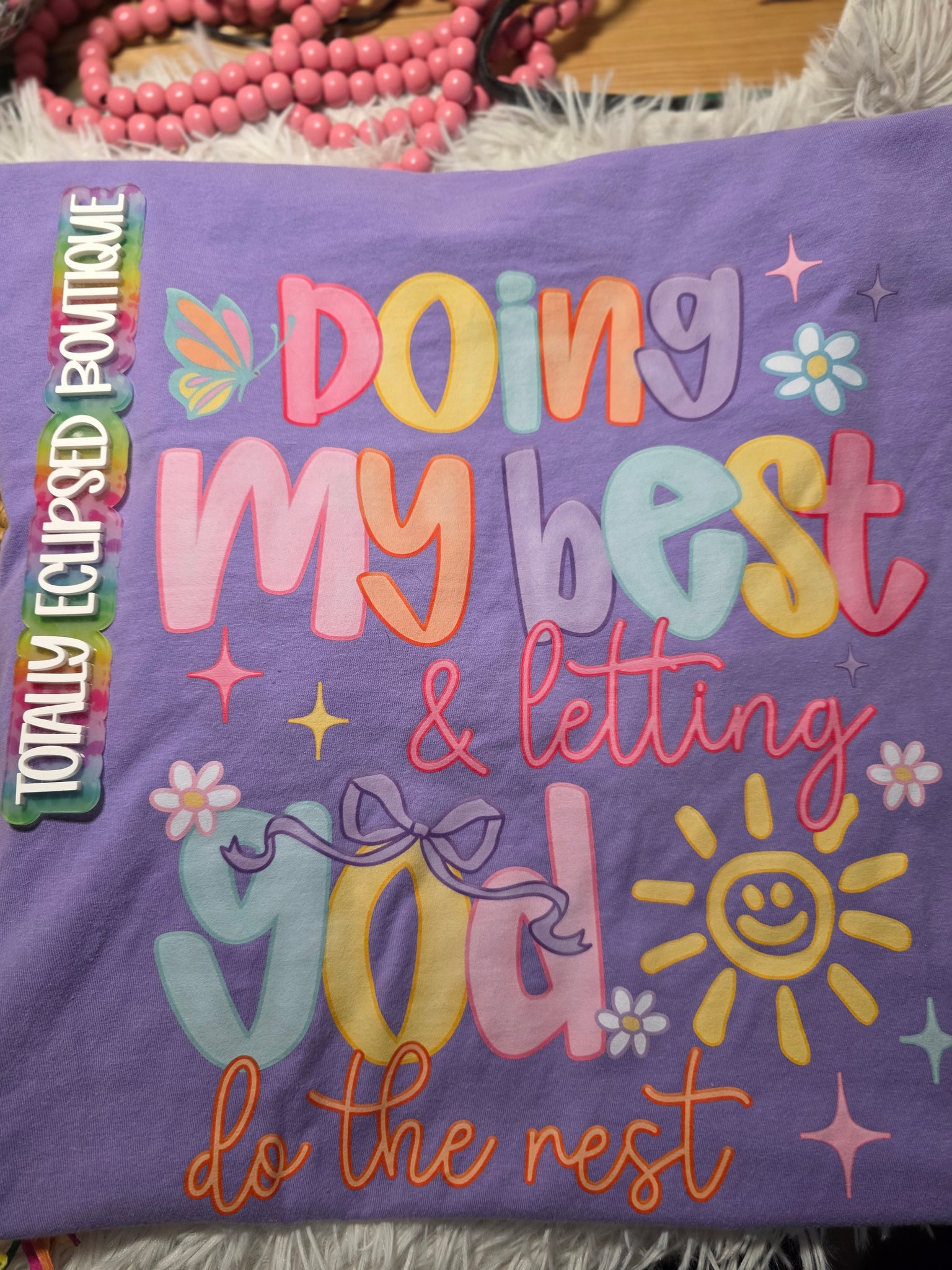 "Don't sweat the small stuff (or the big stuff) in our Doing my Best tshirt. Featuring a soft Comfortwash material and two shades of purple, this shirt is as easy on the eyes as it is on the soul. Ready to ship or pick up, this shirt is perfect for showing off your faith in a playful, stylish way."