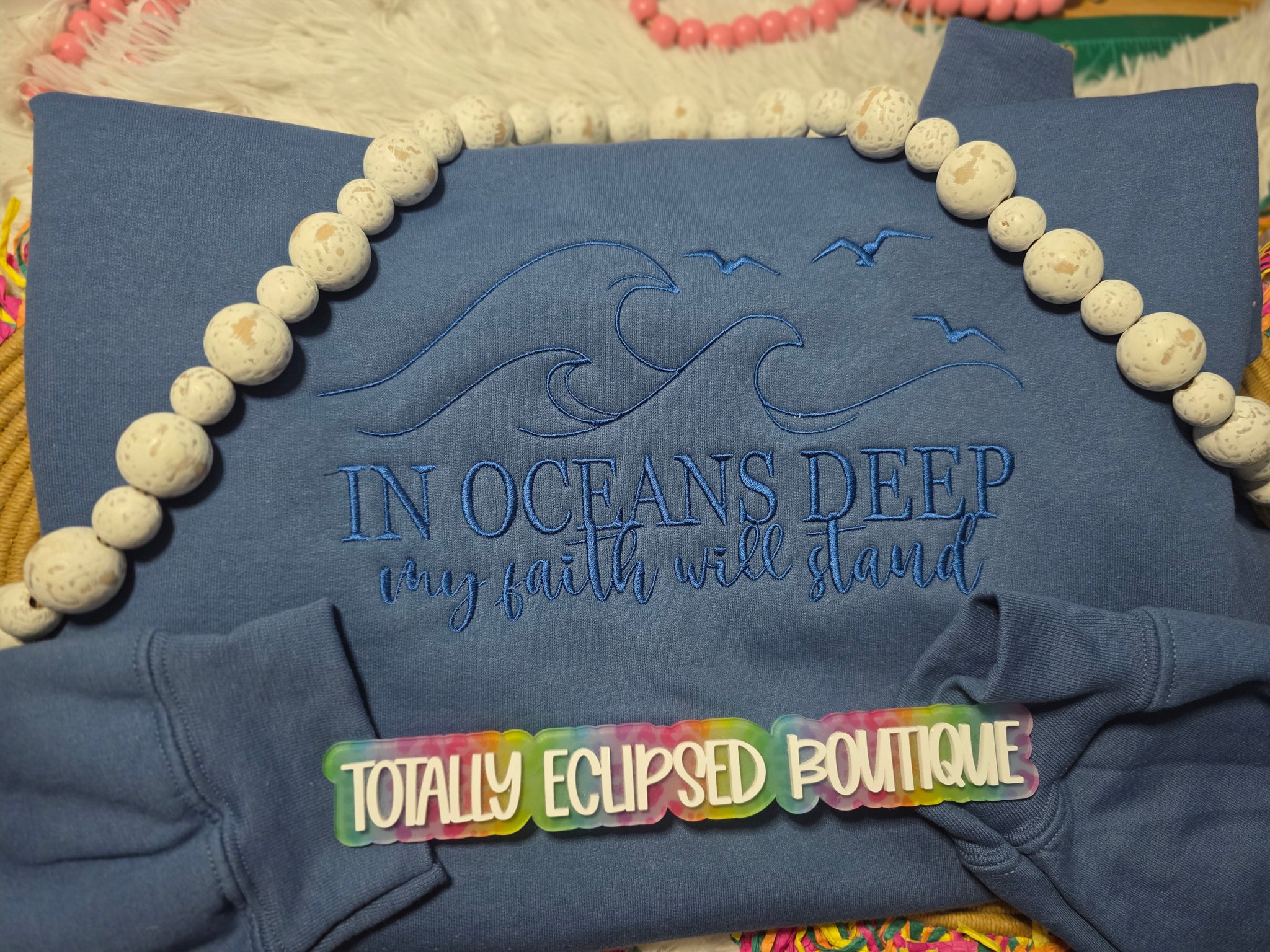 Get ready to dive into style with our "In Oceans Deep My Faith Will Stand" embroidered sweatshirt, perfect for showcasing your faith in a fun and playful way. With intricate embroidery and a cozy fit, this sweatshirt is a must-have for any believer looking to make a statement.